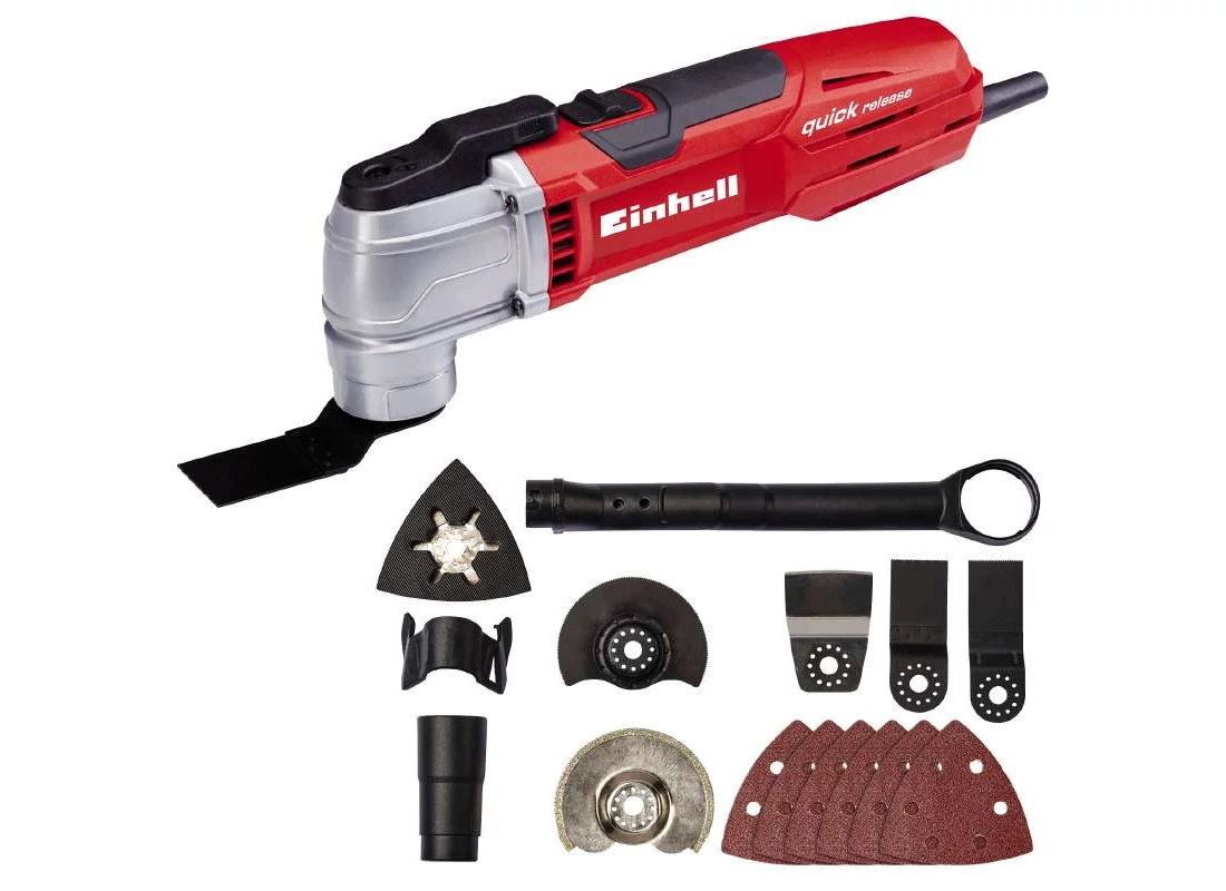 A TE-MG 300 EQ multifunkciós szerszám egy praktikus és sokoldalú készülék, amely a barkácsolók legmagasabb igényeit is maximálisan kielégíti. A multifunkciós szerszámmal fát, műanyagot és fémet vághat. Sőt, a fát még meg is csiszolhatja vele. A csempék fugáit is könnyedén eltávolíthatja a készülékkel. A 300 W-os motornak köszönhetően a TE-MG 300 EQ készüléknek még a nagy teljesítményt igénylő munkák sem jelenthetnek gondot, a fordulatszám szabályozó elektronika átállításával pedig kiválaszthatja, hogy milyen fordulatszámmal munkálja meg az adott anyagot. A konstans elektronika minden helyzetben segít a teljesítmény fenntartásában. A gyorsrögzítő segítségével gyorsan kicserélheti a szerszámokat anélkül, hogy más szerszámokra is szüksége lenne. A 12 fokozatba állítható szerszámtartó rugalmas munkavégzést biztosít. A kényelmes Softgrip markolat biztos és kényelmes munkát garantál. A mellékelt porelszívó berendezést szerszám nélkül felszerelheti a készülékre. Ezen felül még egy porszívó adaptert is talál a csomagolásban. A csomagolásban talál egy merülő fűrészlapot fával és műanyaggal történő munkákhoz (HCS), egy BIM merülő fűrészlapot fémhez (HSS), egy BIM szegmentált fűrészlapot fához, műanyaghoz és fémhez (HSS), és egy szegmentált fűrészlapot gyémánt bevonattal, fugákhoz. A gyári csomagolásában található még egy darab háromszög alakú csiszolólap, hat darab csiszolóvászon (3*P60/3*P120), és egy kaparó szerszám. A készüléket a mellékelt praktikus kofferben tárolhatja, szállíthatja.